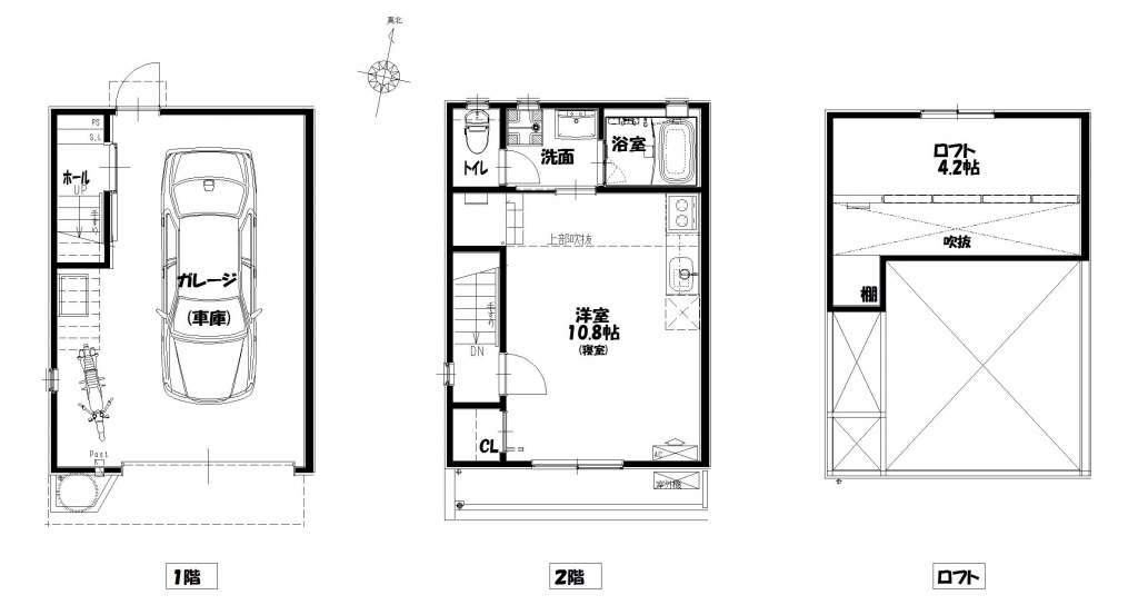 | E | ロフト付1K | LDK10.8帖+ロフト4.2帖 | ガレージ幅4.55m×奥行き6.37m(いずれも最大部分) | ー | 電動シャッター幅3.0m 高さ2.2m(図面上寸法) | 入居中 |