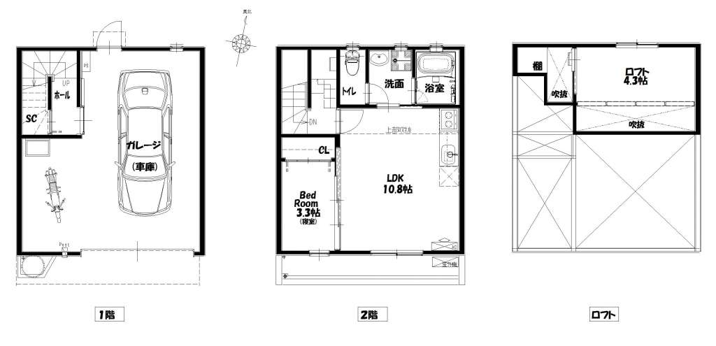 | B | ロフト付1LDK | LDK10.8帖+洋室3.3帖+ロフト4.3帖 | ガレージ幅5.7m×奥行き6.37m(いずれも最大部分) | ー | 電動シャッター幅3.45m 高さ2.2m(図面上寸法) | 入居中 | ||