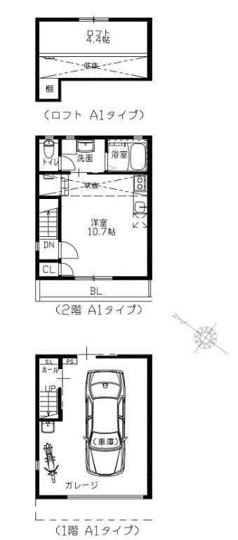 | C | ロフト付1K | 10.7帖+ロフト4.4帖 | 4.8m×6.0m(最大部分) | ー | リモコン式電動シャッター付ガレージ(幅3.2m×高さ2.2m) | 入居中 | ||