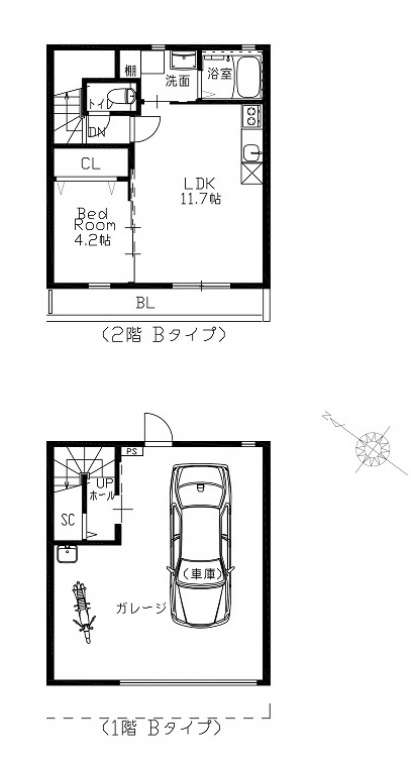 | B | 1LDK(B) | LDK11.7帖+洋室4.2帖 | 6.0m×6.6m(最大部分) | ー | リモコン式電動シャッター付ガレージ(幅3.74m×高さ2.15m) | 入居中 | ||