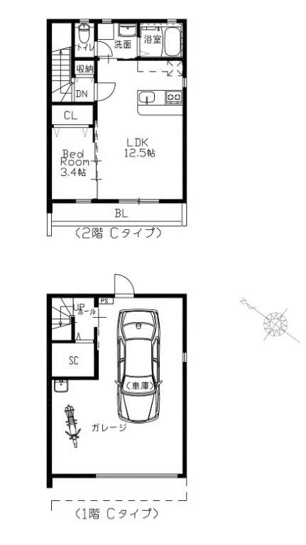 | A | 1LDK(C) | LDK12.5帖+洋室3.4帖 | 5.4m×7.2m(最大部分) | ー | リモコン式電動シャッター付ガレージ(幅3.2m×高さ2.2m) | 入居中 | ||