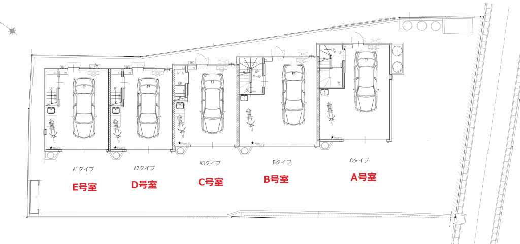 | E | ロフト付1K | 10.7帖+ロフト4.4帖 | 4.8m×6.0m(最大部分) | ー | リモコン式電動シャッター付ガレージ(幅3.2m×高さ2.2m) | 入居中 |
