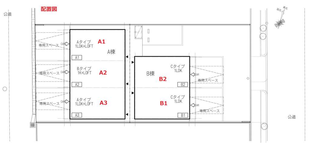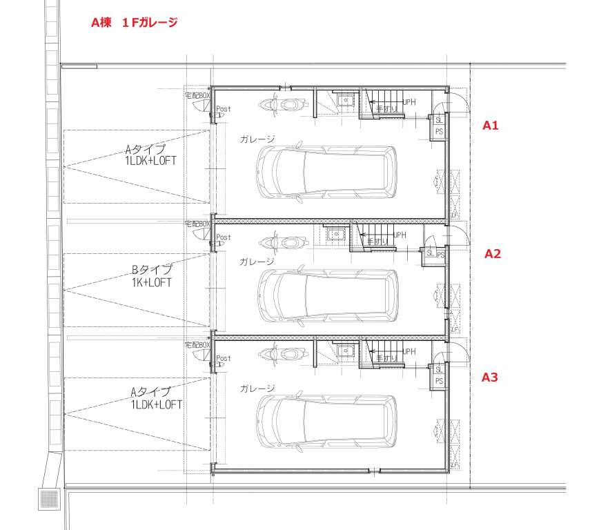 | A2 | 1Kロフト付き | 洋室11.6帖+ロフト4.5帖 | ガレージ幅3.9m×奥行7.9m(最大部分) | ー | リモコン式電動シャッター幅2.7m×高さ2.2m | 入居中 | ||