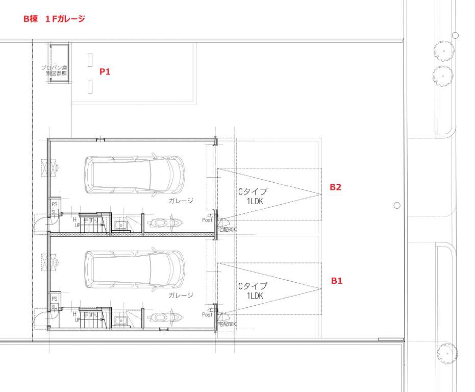 | B1 | 1LDK | LDK11帖+洋室3.9帖 | ガレージ幅4.4m×奥行7.9m(最大部分) | ー | リモコン式電動シャッター幅3.0m×高さ2.2m | 入居中 | ||