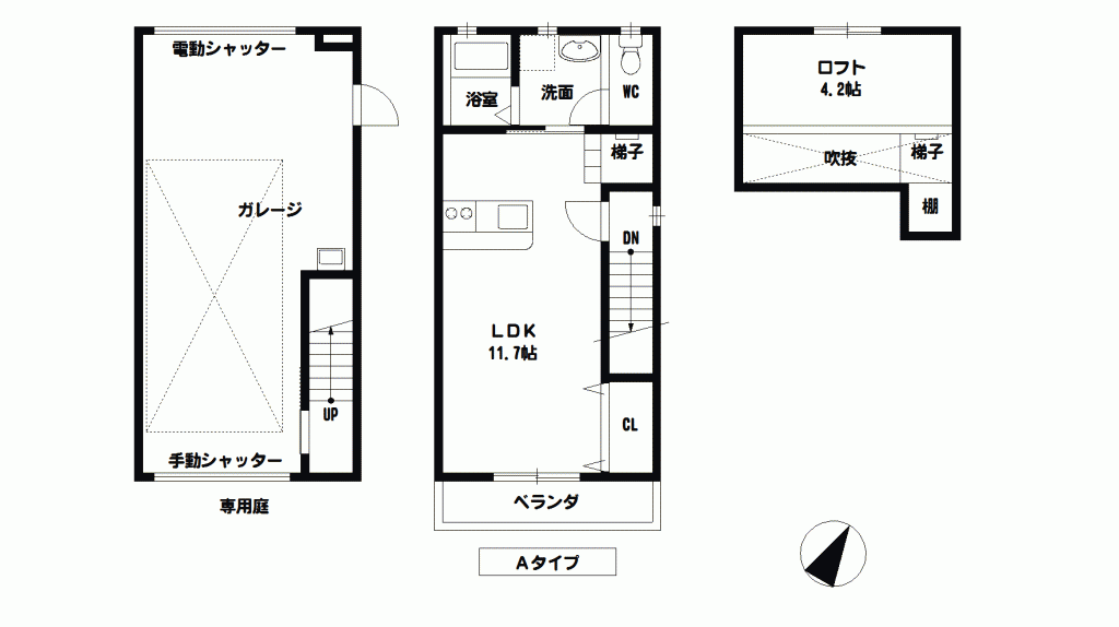 | A | ロフト付1K | 11.7帖 | ガレージ幅4.0m×奥行8.19(最大部分) | ー | シャッター幅2.6m×高さ2.2m | 入居中 | ||