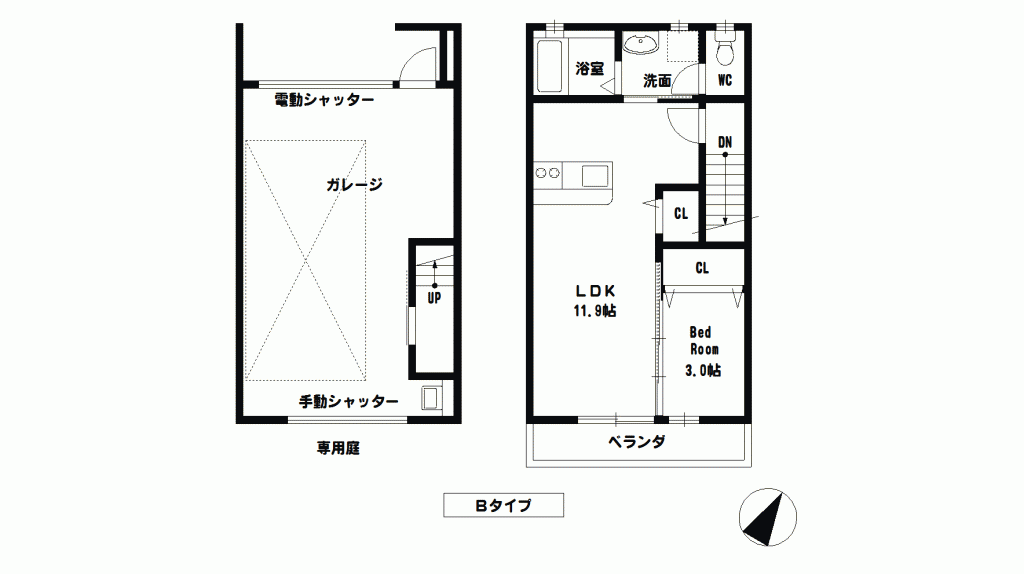 | B | 1LDK | LDK11.9帖+洋室3帖 | ガレージ幅4.55m×奥行7.0m(最大部分) | ー | シャッター幅2.8m×高さ2.2m | 入居中 | ||