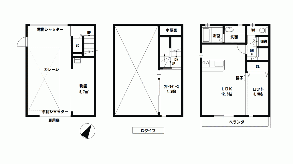 | C | 1LDK | LDK11.9帖+洋室3帖 | ガレージ幅4.55m×奥行7.0m(最大部分) | ー | シャッター幅2.8m×高さ2.2m | 入居中 | ||
