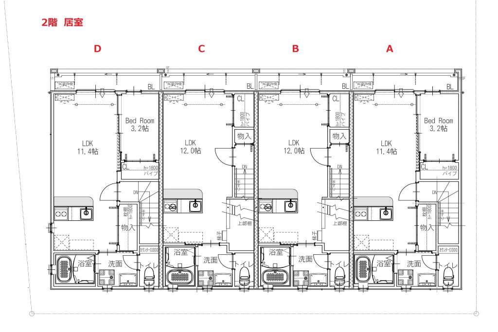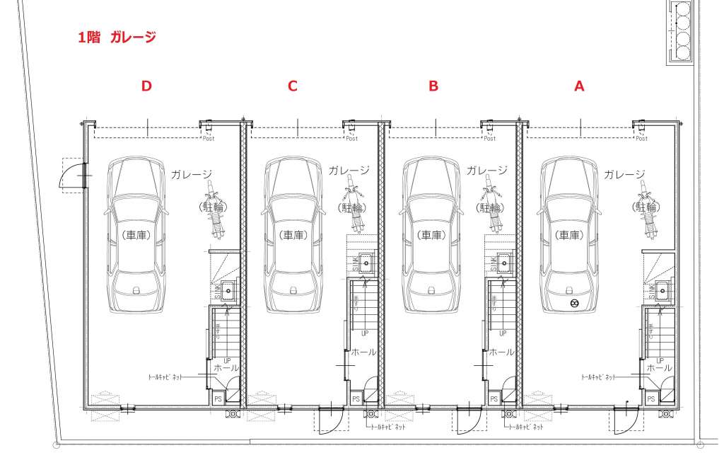 | Ⅾ | 1LDK | LDK11.4帖+洋室3.2帖 | ガレージ幅4.55m×奥行8.19m(最大部分) | ー | リモコン式電動シャッター幅3.0m×高さ2.2m | 入居中 |