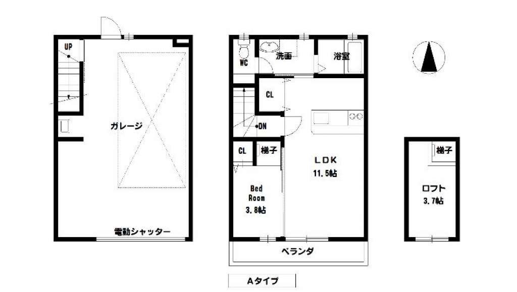 | 広さ | 11.5帖+洋室約4帖+ロフト3.8帖 |