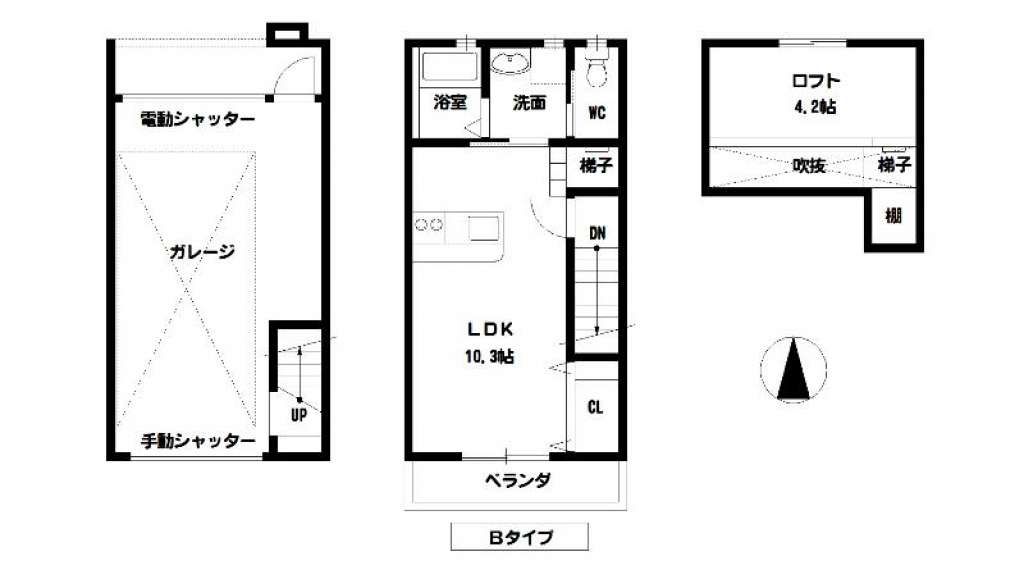 | ⅡーC | ロフト付1K | 10.3帖+ロフト4.3帖 | 6.5m×2.95m 駐輪スペース3.90㎡ | ー | シャッター:幅2.6m、高さ2.2m | 入居中 |