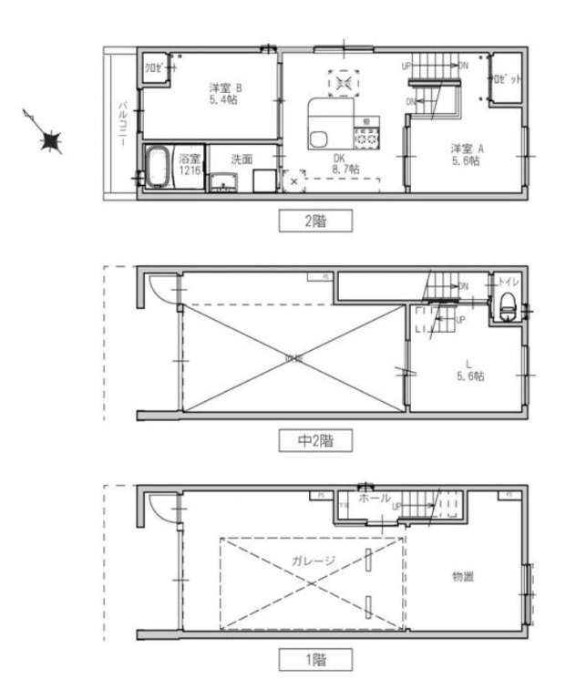 | G1 | 中2階2LDK | L5.6帖+DK8.7帖+洋室5.4帖+洋室5.6帖 | ガレージ幅4.0m×奥行9.4m(最大部分) | ー | シャッター幅3.0m×高さ2.15m | 入居中 | ||