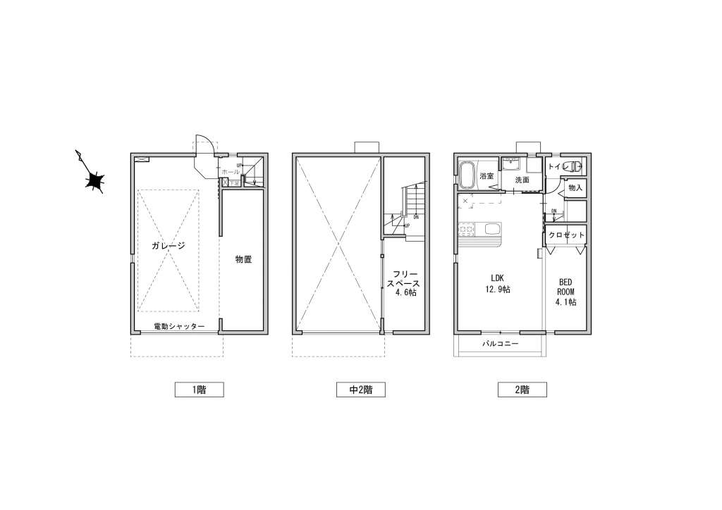 | 2 | 2LDK | LDK12.9帖+洋室4.3帖+bedroom4.1帖 | ガレージ幅5.4m×奥行7.2m(最大部分)一部高さ1.4m | ー | シャッター幅3.1m×高さ2.1m | 入居中 |
