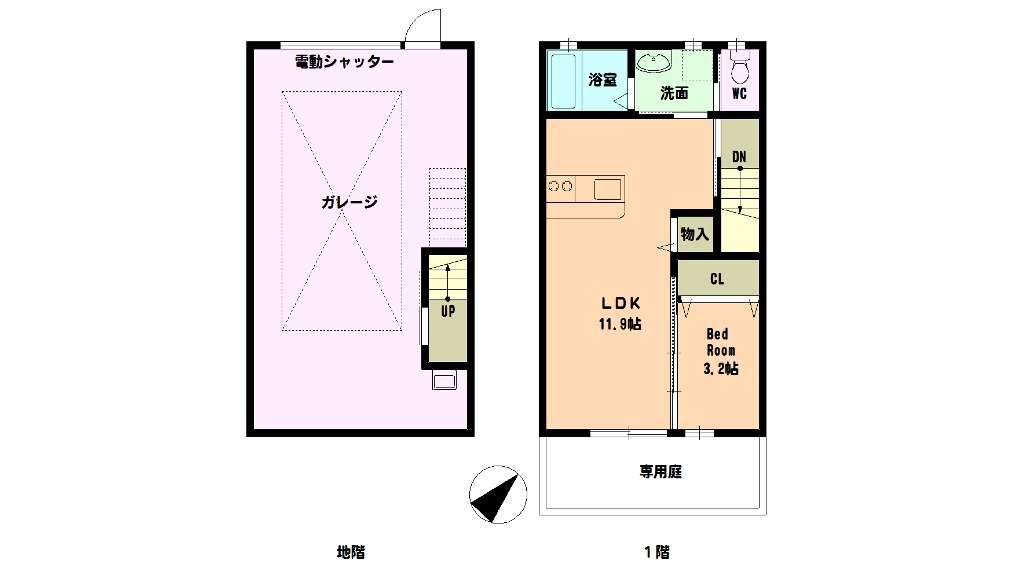 | M-102 | 1LDK | LDK11.9帖+洋室3.2帖 | ガレージ幅4.5m×奥行8.0m(最大部分) | ー | シャッター幅3.4m×高さ2.1m | 入居中 | ||