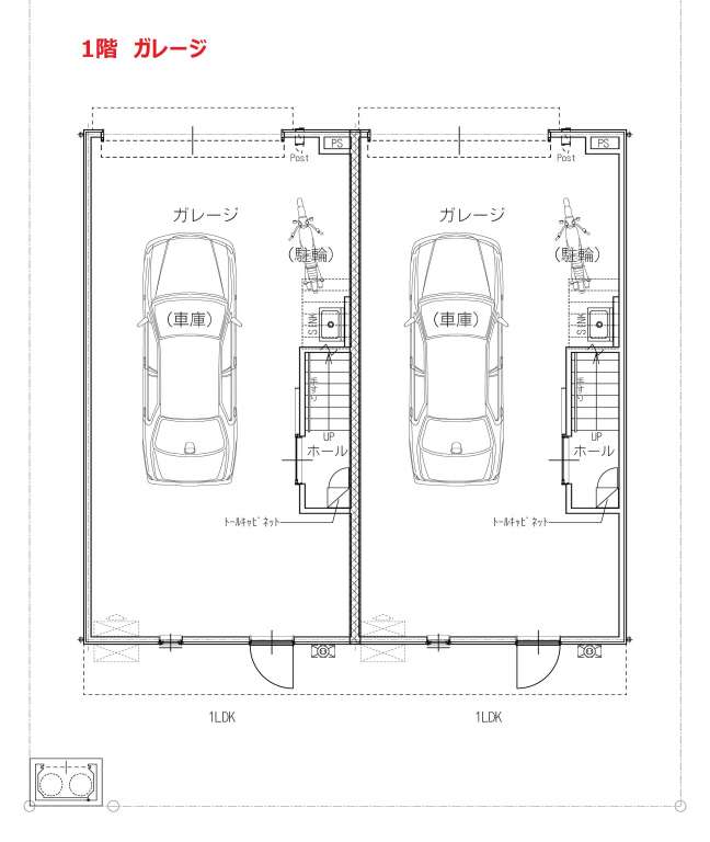 | B | 1LDK | LDK14.5帖+洋室4.2帖 | ガレージ幅4.8m×奥行9.1m(最大部分) | ー | シャッター幅3.2m×高さ2.2m | 入居中 |