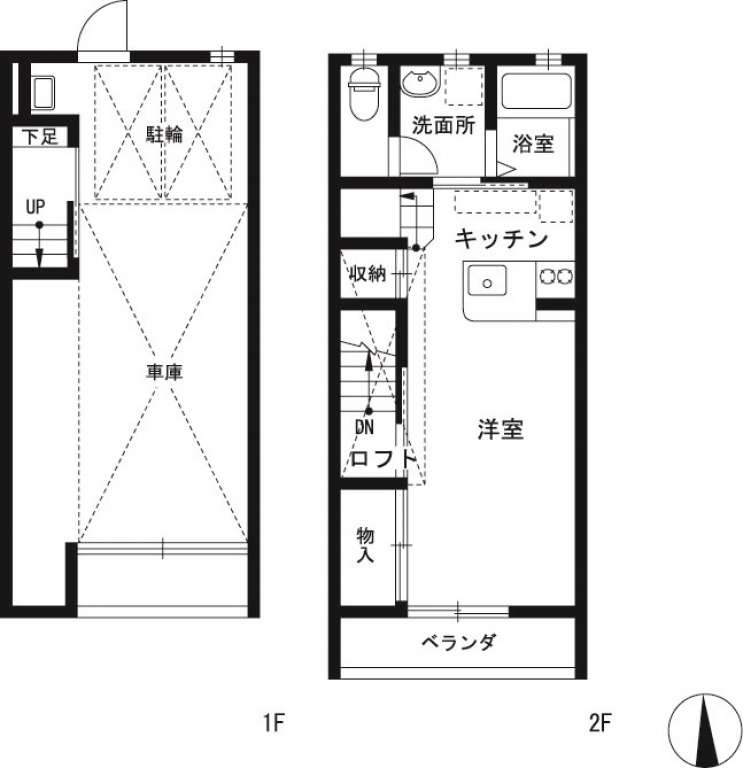 | 103 | ロフト付1K | LDK9帖+ロフト2.9帖 | ガレージ幅3650mm×7200mm(最大部分) | ー | 電動シャッター幅3120mm×高さ2200mm | 入居中 | ||