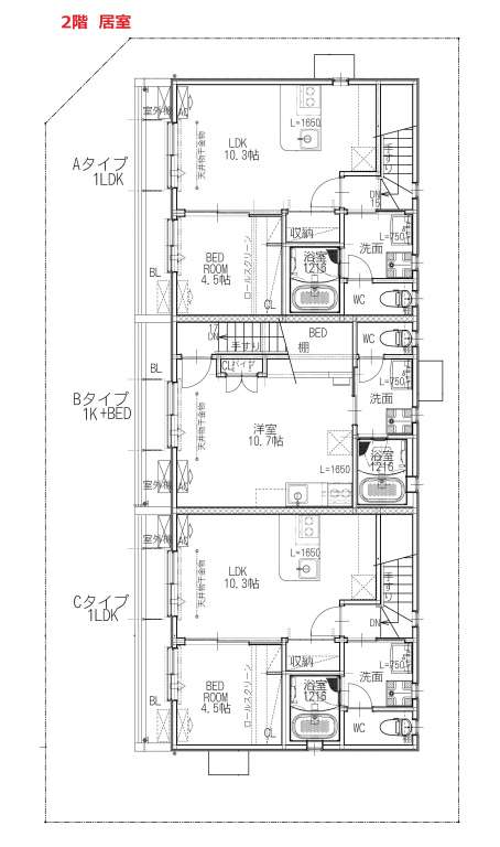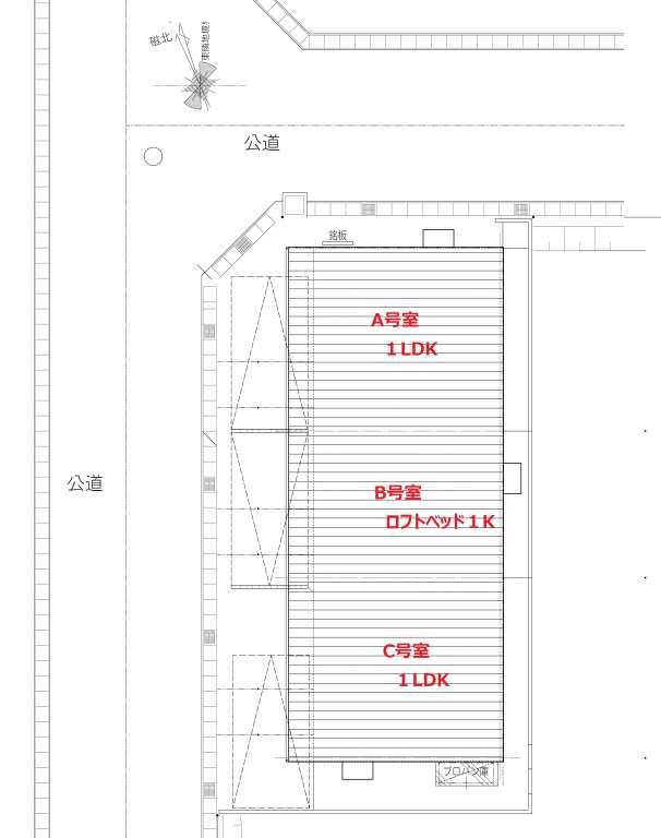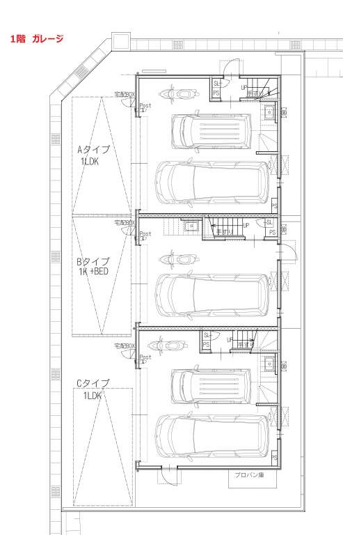 | A | 1LDK | LDK10.3帖+洋室4.5帖 | ガレージ幅5.8m×奥行5.9m(最大部分) | ー | リモコン式電動シャッター幅3.9m×高さ2.2m | 入居中 | ||