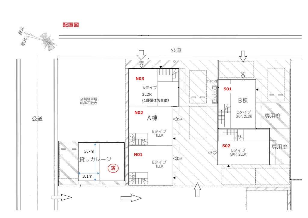 | N02 | 1LDK | LDK11.6帖+洋室3.3帖 | ガレージ幅5.9m×奥行6.3m(最大部分) | ー | シャッター幅3.3m×高さ2.2m | 入居中 | ||