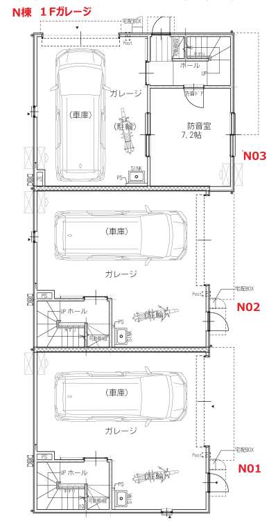 | N03 | 2LDK・1部屋は防音室(音スタイル) | LDK14.0帖+洋室4.1帖+防音室7.2帖 | ガレージ幅4.1m×奥行5.6m(最大部分) | ー | シャッター幅2.8m×高さ2.2m | 入居中 | ||