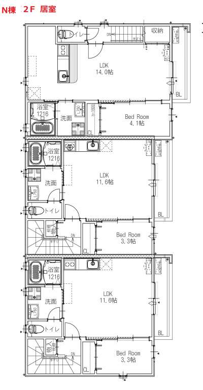 | N01 | 1LDK | LDK11.6帖+洋室3.3帖 | ガレージ幅5.9m×奥行6.3m(最大部分) | ー | シャッター幅3.3m×高さ2.2m | 入居中 | ||