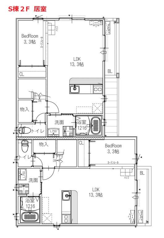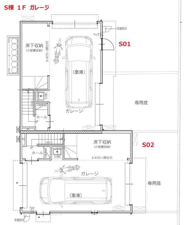 | S01 | 2LDKスキップフロア | LDK13.3帖+洋室3.3帖+中2階4.2帖 | ガレージ幅5.3m×奥行7.4m(最大部分) | ー | シャッター幅3.0m×高さ2.2m | 入居中 | ||
