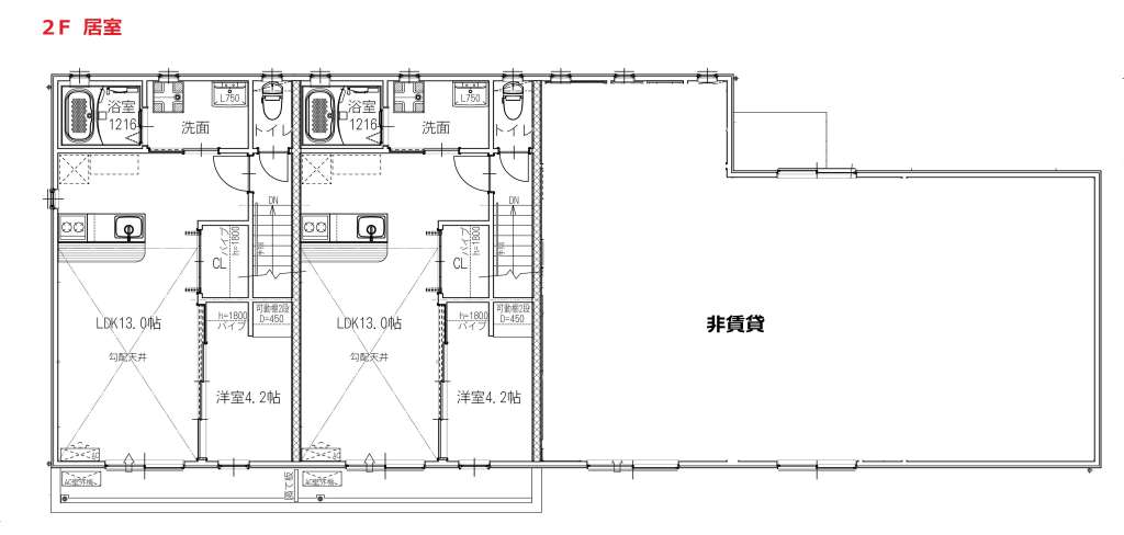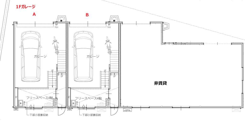| B | 1LDK+フリースペース付 | LDK13.0帖+洋室4.2帖+フリースペース(ガレージ内)4.0帖 | ガレージ幅5.0m×奥行6.2m(最大部分) | ー | シャッター幅3.4m×高さ2.5m | 入居中 | ||