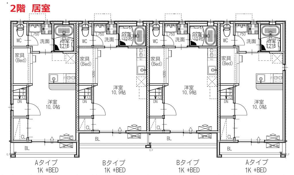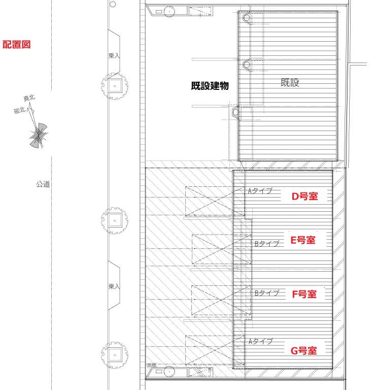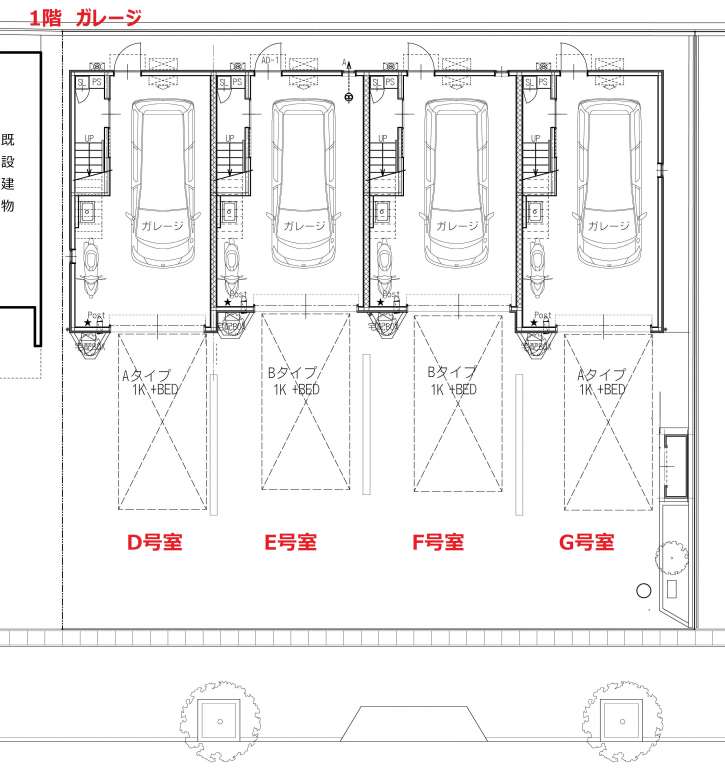 | E号室 | 1Kロフトベッド付き | 洋室10.9帖+ロフトベッド | ガレージ幅4.1m×奥行6.4m(最大部分) | ー | リモコン式電動シャッター幅2.9m×高さ2.2m | 入居中 | ||