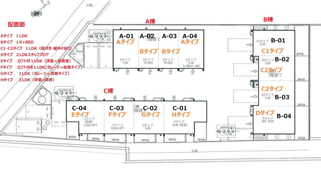 ■全12戸(1Kロフトベッド2戸/1LDK5戸/2LDKスキップフロア1戸/1LDKロフト付き(防音ガレージタイプ)1戸/1LDKロフト付き(防音タイプ)1戸/1LDK(防音ガレージタイプ)1戸/2LDK(防音タイプ)1戸