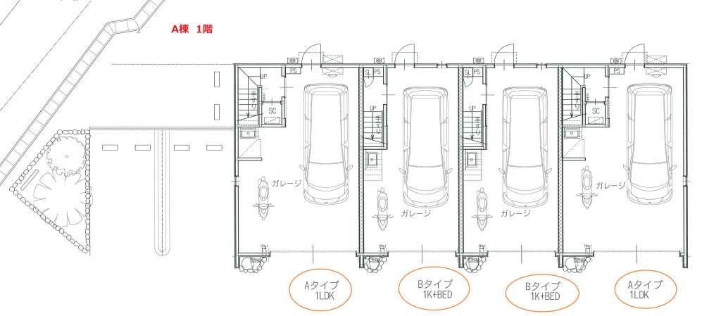 | A-01 | Aタイプ:1LDK | LDK10.4帖+洋室3.7帖 | ガレージ幅5.0m×奥行7.5m(最大部分) | ー | シャッター幅3.4m×高さ2.2m | 入居中 | ||