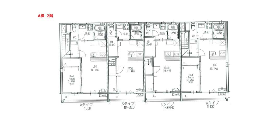 | A-04 | Aタイプ:1LDK | LDK10.4帖+洋室3.7帖 | ガレージ幅5.0m×奥行7.5m(最大部分) | ー | シャッター幅3.4m×高さ2.2m | 入居中 | ||