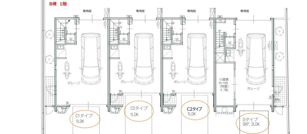 | B-01 | C1タイプ:1LDK(専用庭付き) | LDK12.4帖+洋室4.1帖 | ガレージ幅5.0m×奥行8.1m(最大部分) | ー | シャッター幅3.4m×高さ2.2m庭側:手動シャッター2.2m×高さ2.2m | 入居中 | ||