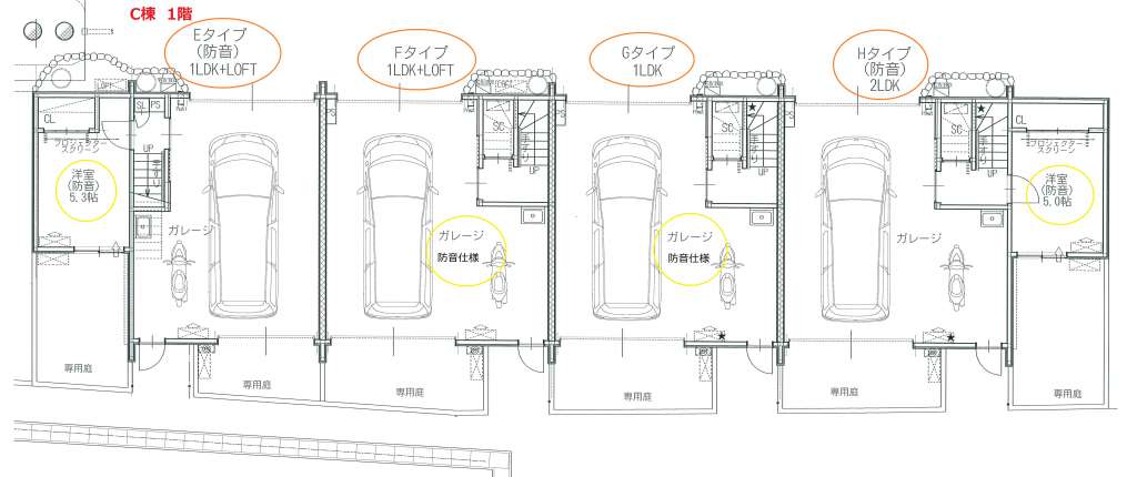 | C-04 | Eタイプ:1LDKロフト付き(防音室・専用庭付き) | LDK12.3帖+防音室5.3帖+ロフト5.9帖 | ガレージ幅5.0m×奥行6.3m(最大部分) | ー | シャッター幅3.2m×高さ2.2m庭側:手動シャッター2.5m×高さ2.2m | 入居中 |