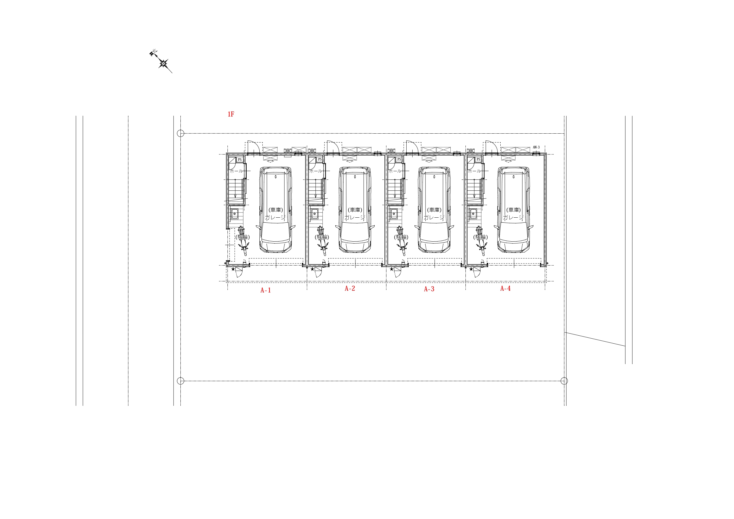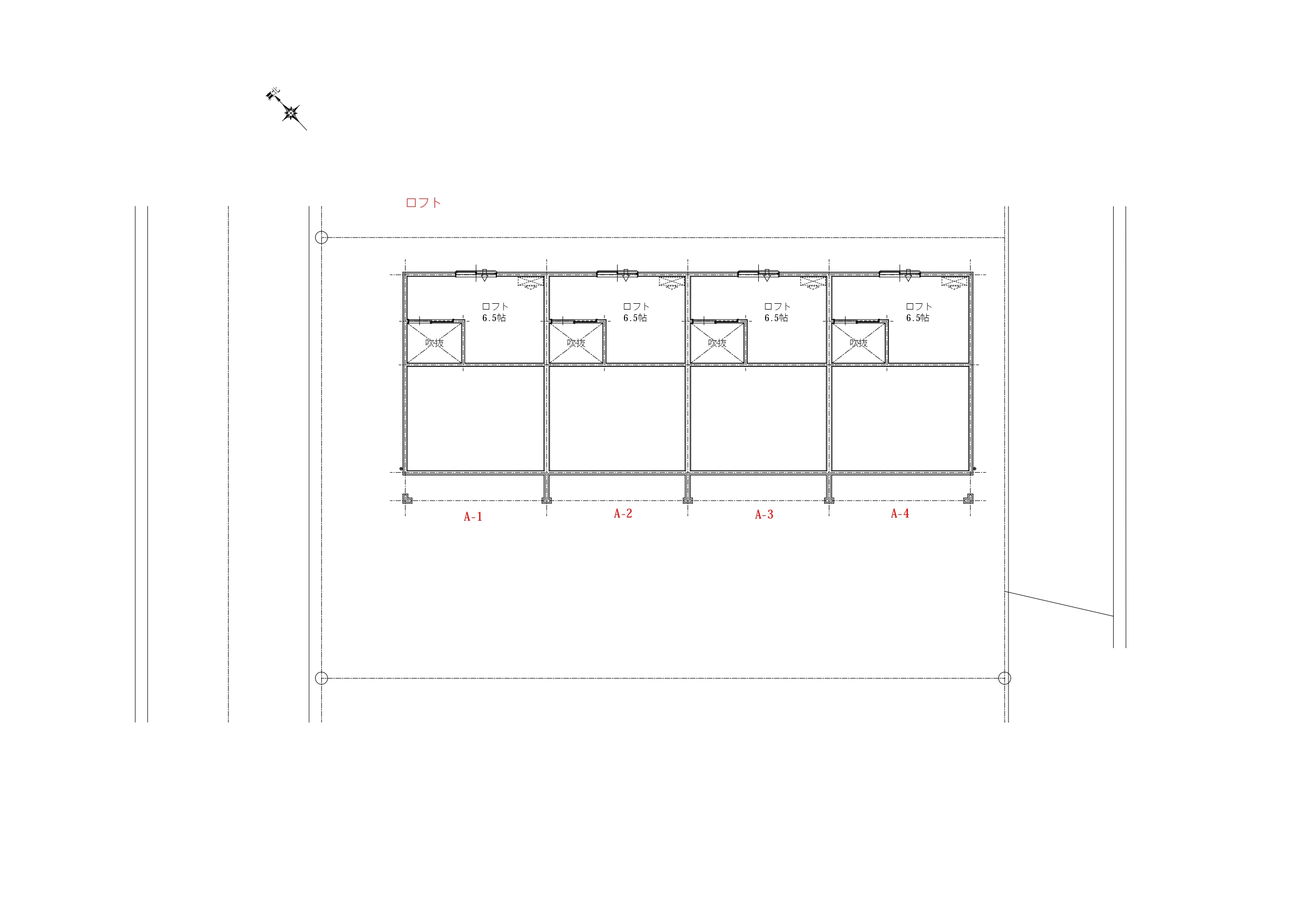 | A4 | ロフト付1K | LDK10.8帖+ロフト6.5帖 | ガレージ幅4.4m×奥行6.3m(最大部分) | ー | リモコン式電動シャッター幅3.0m×高さ2.2m | 入居中 | ||