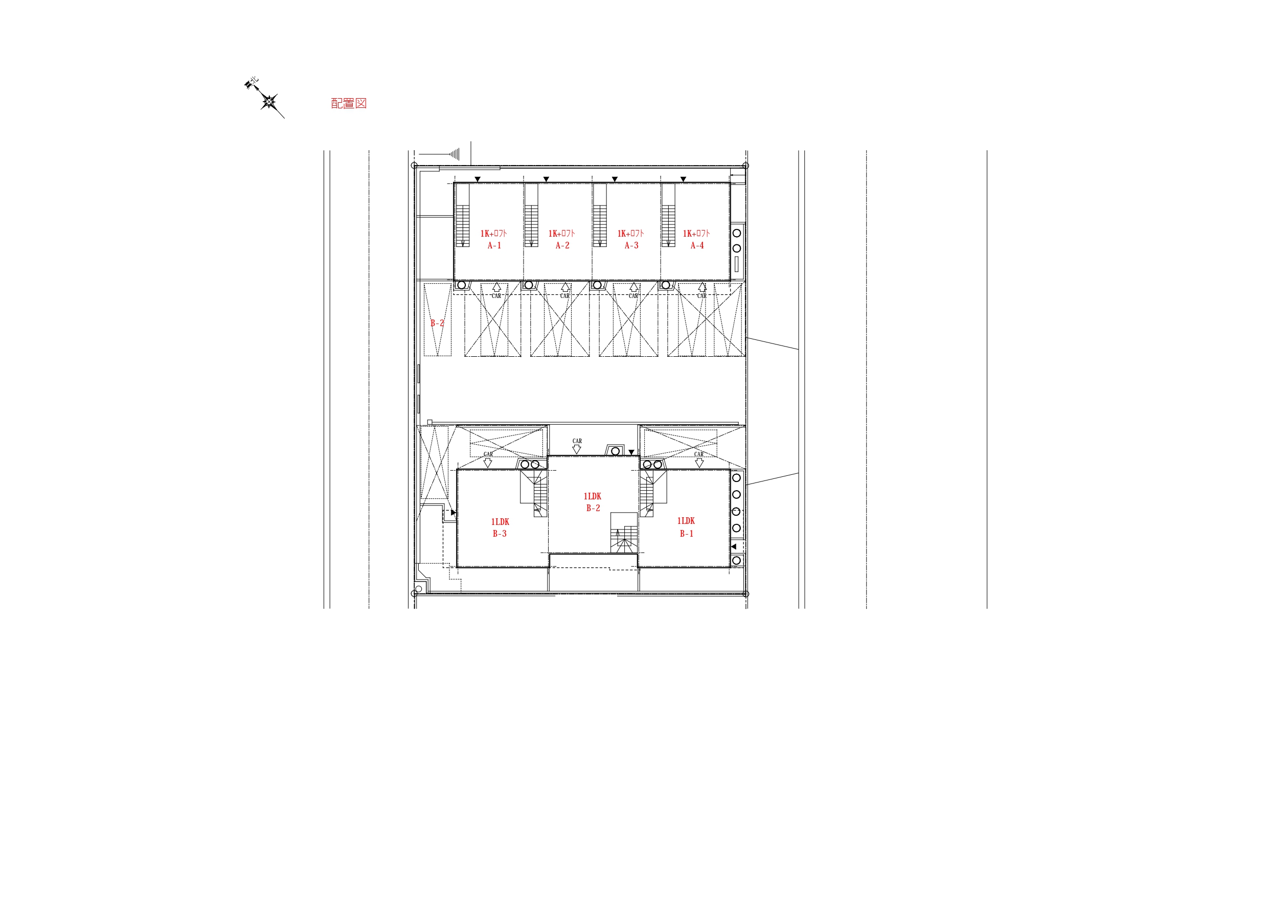 | A1 | ロフト付1K | LDK10.8帖+ロフト6.5帖 | ガレージ幅4.4m×奥行6.3m(最大部分) | ー | リモコン式電動シャッター幅3.0m×高さ2.2m | 入居中 | ||