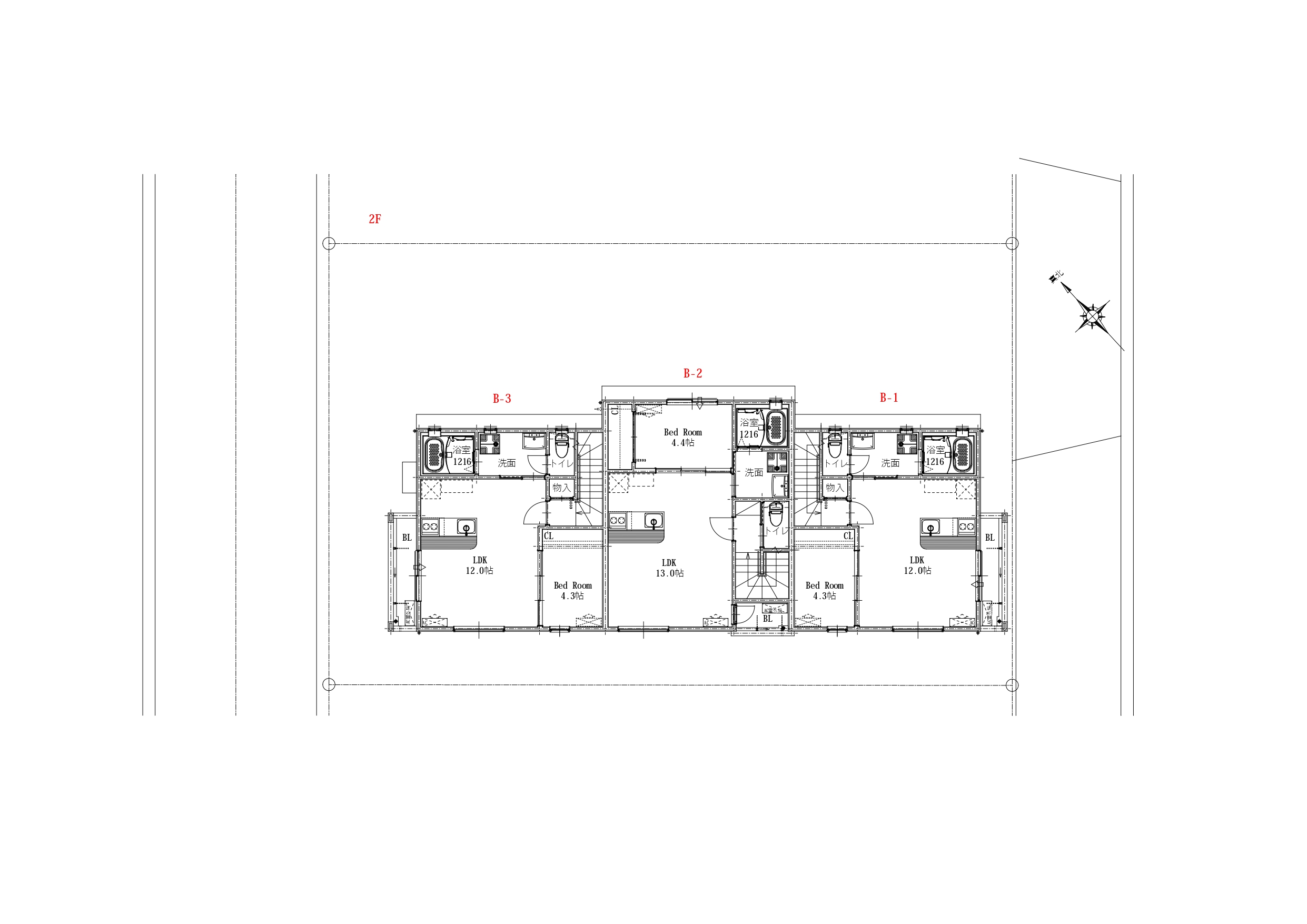 | B2 | 1LDK | LDK13.0帖+洋室4.4帖 | ガレージ幅5.9m×奥行6.3m(最大部分) | ー | リモコン式電動シャッター幅3.3m×高さ2.2m | 入居中 | ||