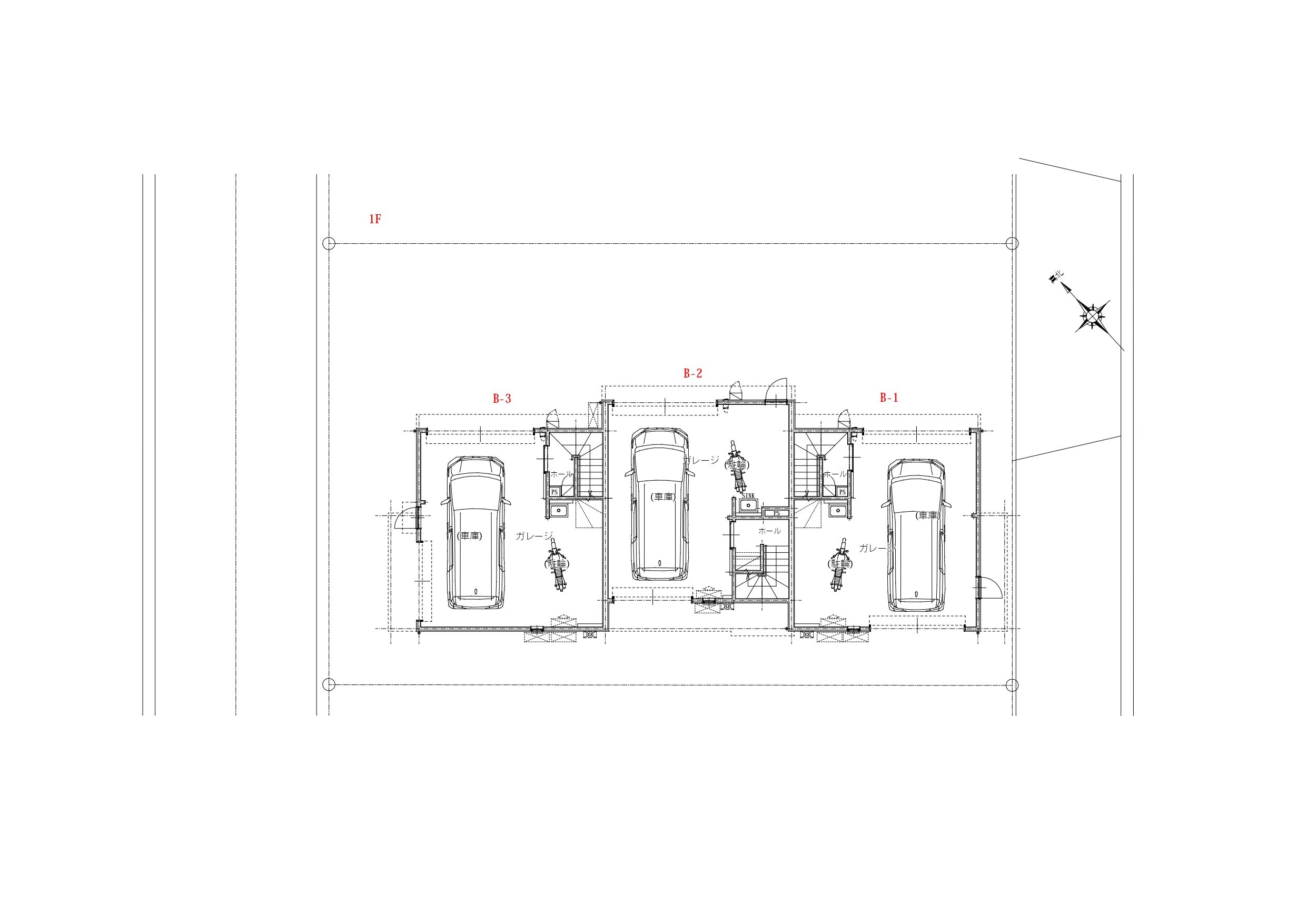| B1 | 1LDK | LDK12.0帖+洋室4.3帖 | ガレージ幅5.9m×奥行6.3m(最大部分) | ー | リモコン式電動シャッター幅3.4m×高さ2.2m | 入居中 | ||