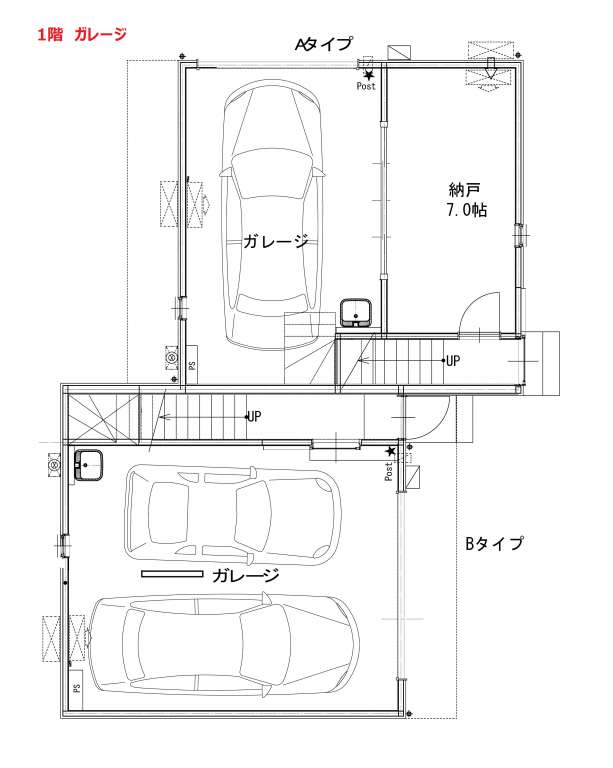 | B | 1LDK(2台格納タイプ) | LDK10帖+洋室3帖 | ガレージ幅4.8m×奥行5.8m(最大部分) | ー | リモコン式電動シャッター幅3.3m×高さ2.6m | 入居中 |