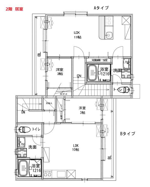 | A | 1SLDK | LDK11帖+洋室3帖+フリースペース7帖 | ガレージ幅3.6m×奥行5.8m(最大部分) | ー | リモコン式電動シャッター幅2.9m×高さ2.4m | 入居中 | ||