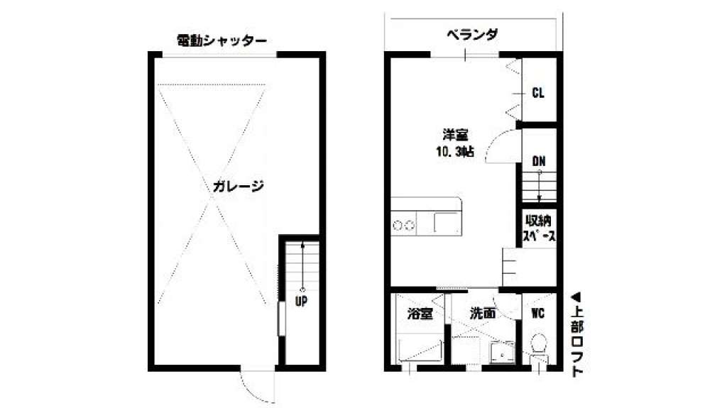 | 1 | ロフト付1K | 10.3帖+ロフト4.4帖 | 7.28m×4.0(最大部分) | ー | リモコン式電動シャッター幅2.6m×高さ2.2m | 入居中 | ||