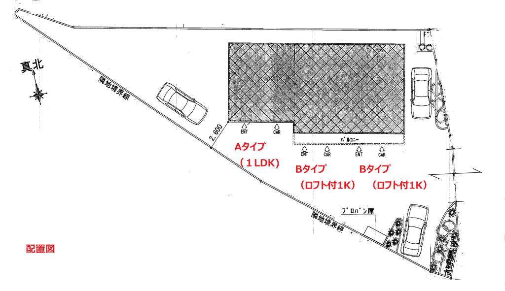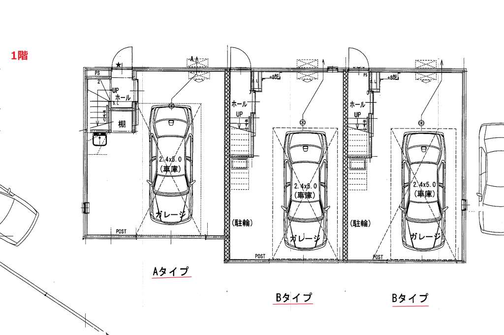 | 103 | ロフト付1K | LDK11.8帖+ロフト4.5帖 | ガレージ幅4.55m×奥行7.28m(最大部分) | ー | リモコン式電動シャッター幅約3m×高さ2.2m | 入居中 |