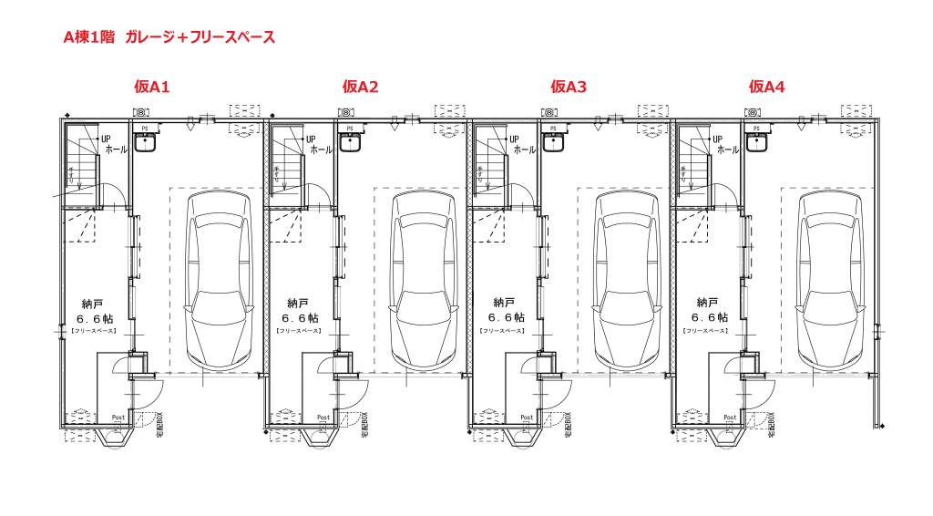| 1棟-104 | 1SLDK | LDK12.6帖+BedRoom3.6帖+フリースペース6.6帖 | ガレージ幅3.6m×奥行6.8m(最大部分) | ー | リモコン式電動シャッター幅2.7m×高さ2.2m | 入居中 | ||