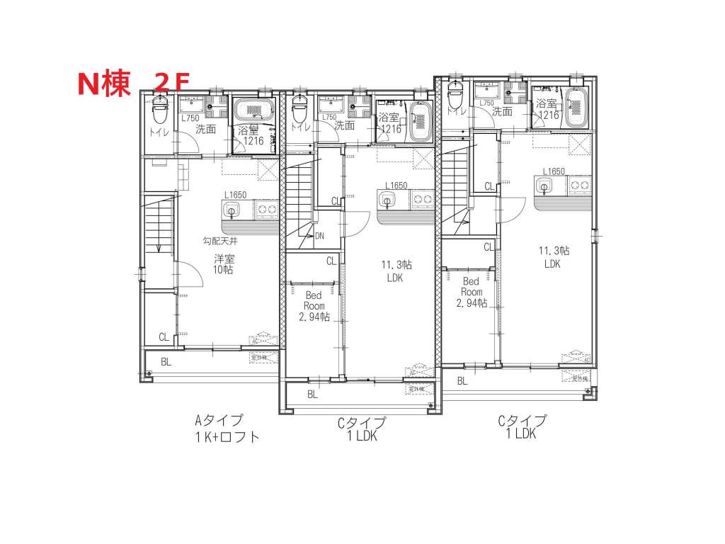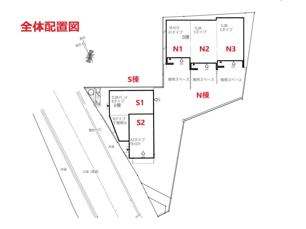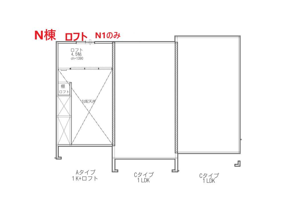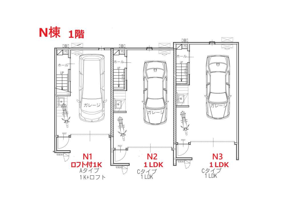 | N1 | 1Kロフト | LDK10.0帖+ロフト4.5帖 | ガレージ幅3.9m×奥行6.1m(最大部分) | ー | シャッター幅2.7m×高さ2.3m | 入居中 | ||