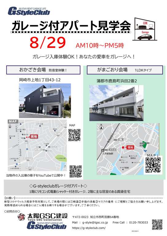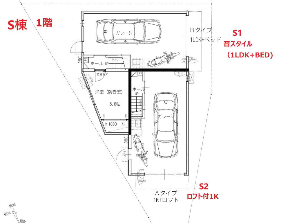 | S1 | 1LDKロフトベッド(防音室付き) | LDK10.0帖+防音室5.8帖 | ガレージ幅3.9m×奥行7.1m(最大部分) | ー | シャッター幅2.8m×高さ2.2m | 入居中 | ||