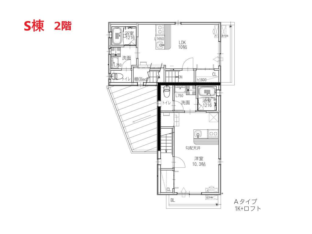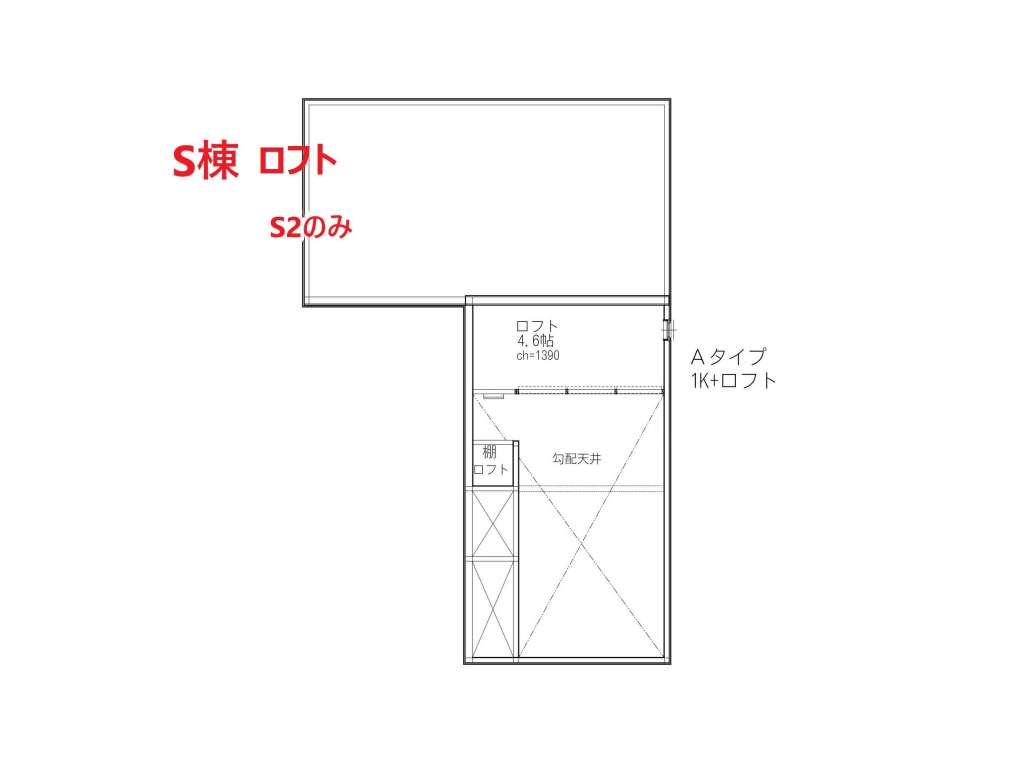 | S2 | 1Kロフト | LDK10.3帖+ロフト4.6帖 | ガレージ幅3.9m×奥行7.1m(最大部分) | ー | シャッター幅2.7m×高さ2.2m | 入居中 |