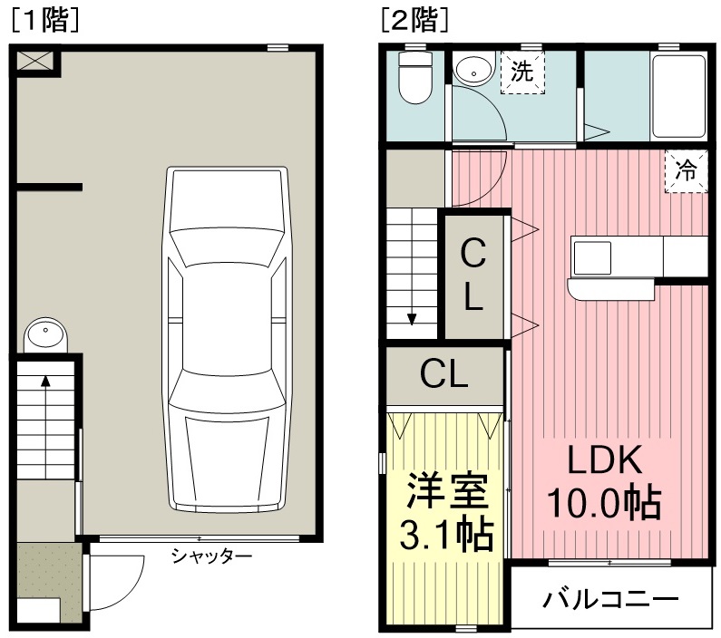 | B | 1LDK | 67.33㎡(ガレージ専有面積を含む) | ガレージ幅3.45m×奥行6.8m | ー | シャッター幅2.8m×高さ2.2m | 入居中 | ||
