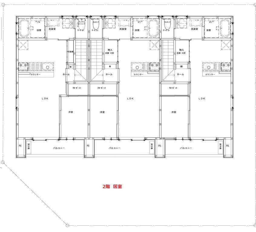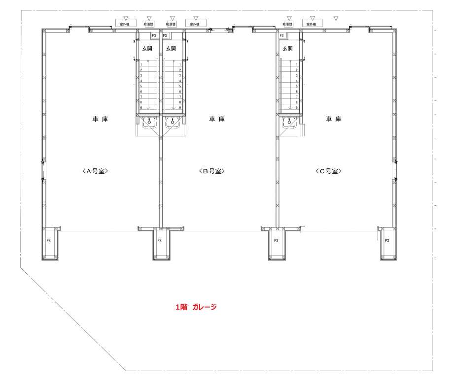 | C | 1LDK | LDK11.5帖+洋室3.0帖 | ガレージ幅4.5m×奥行7.7m(最大部分) | ー | シャッター幅2.9m×高さ2.3m | 入居中 |