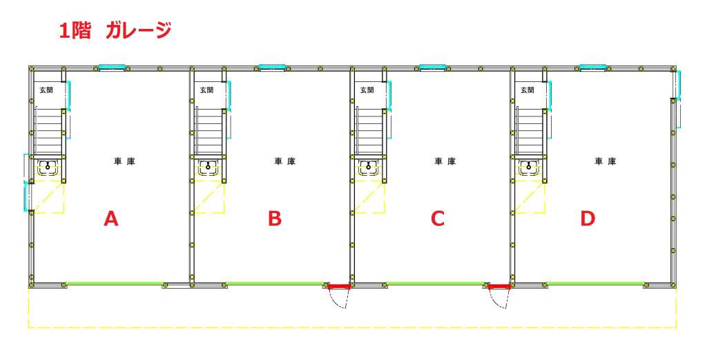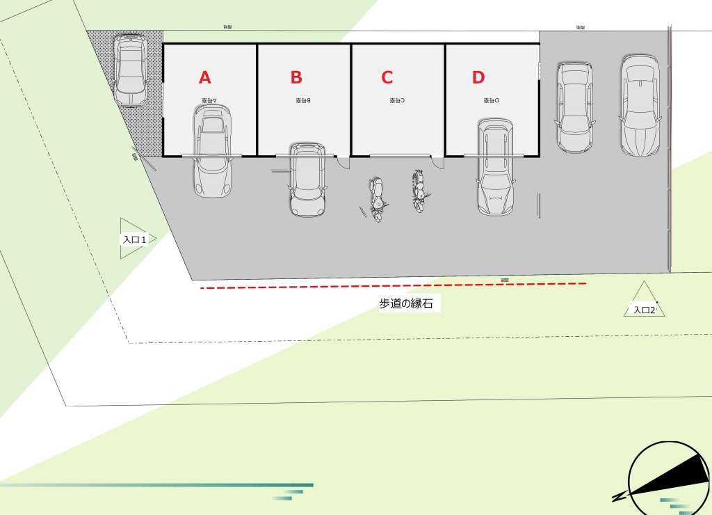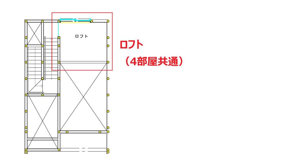 | 4 | 1LDKロフト付き | LDK7.9帖+洋室2.5帖+ロフト4.3帖 | ガレージ幅4.5m×奥行6.1m×高さ2.4m(最大部分・壁芯寸法) | ー | リモコン式電動シャッター幅2.69m×高さ2.3m | 入居中 |