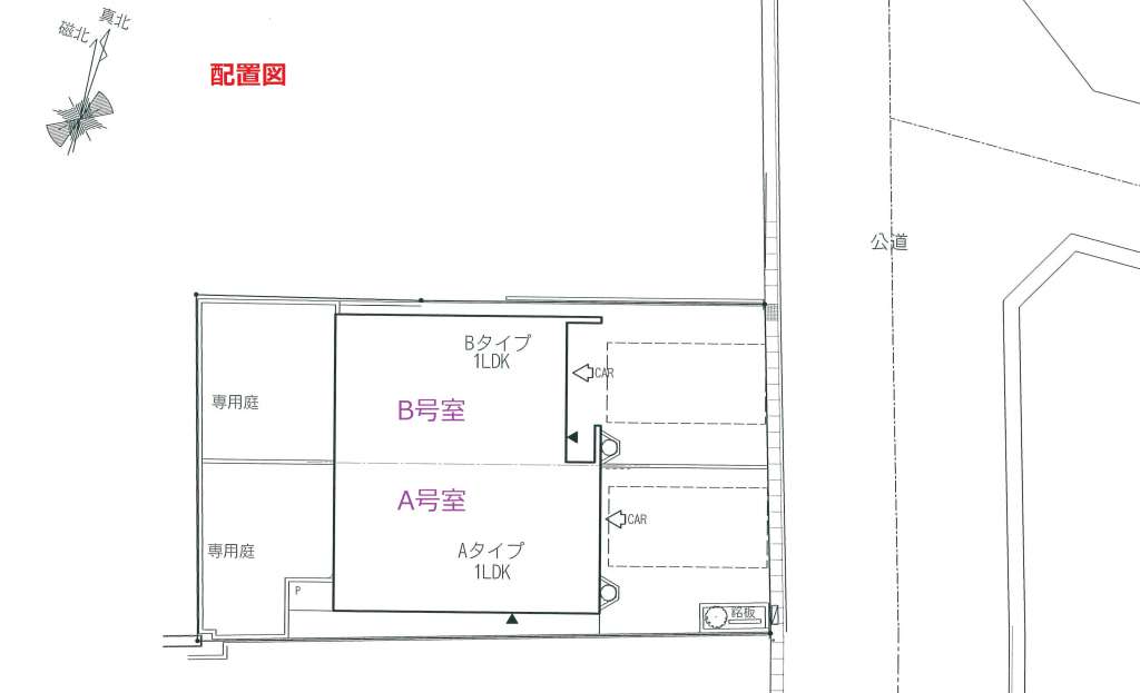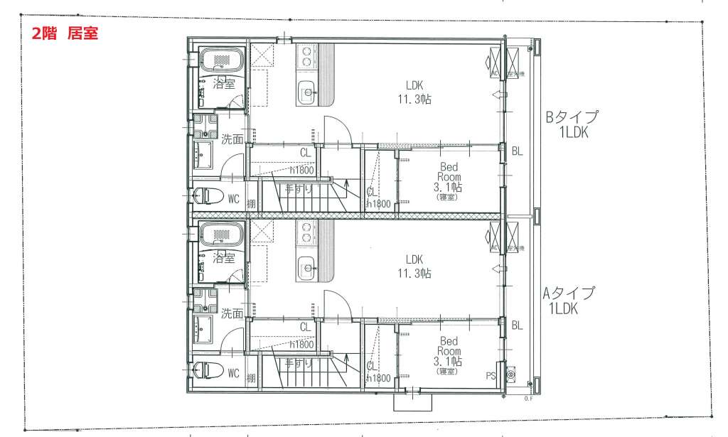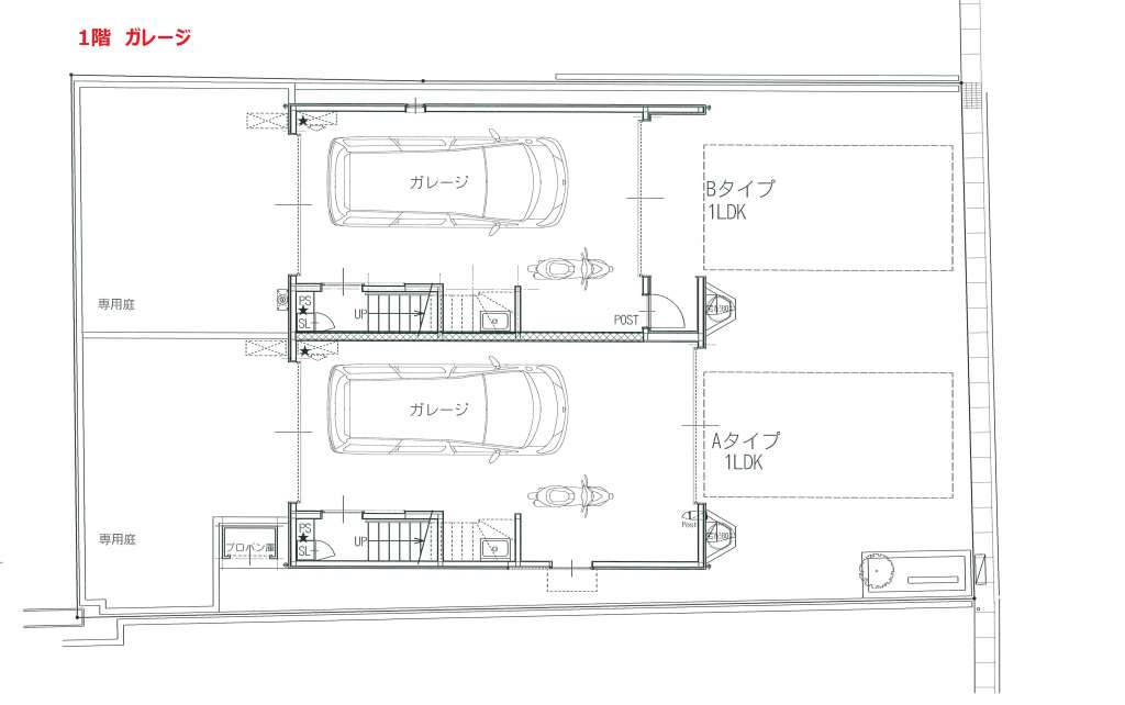 | B | 1LDK | LDK11.3帖+BedRoom3.1帖 | ガレージ幅4.4m×奥行7.0m(最大部分) | ー | シャッター幅3.1m×高さ2.2m | 入居中 |