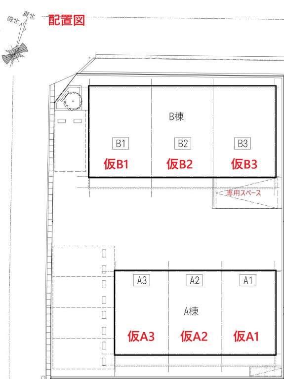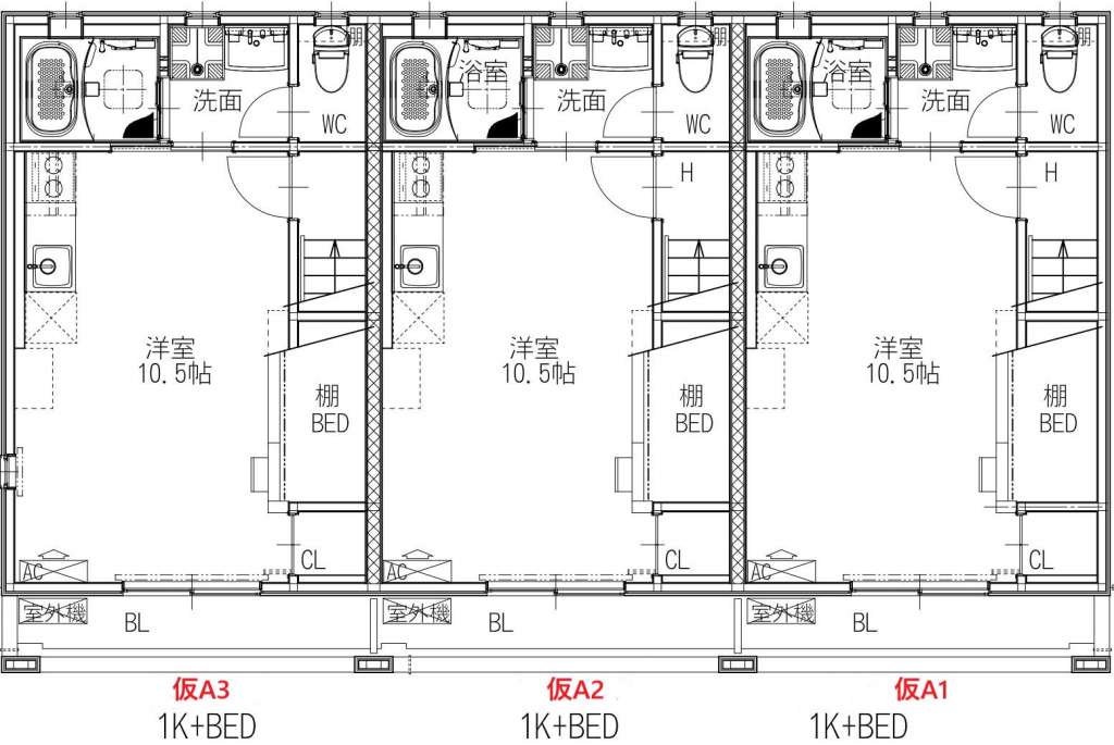 | A1 | 1K+BED | LDK10.5帖 | ガレージ幅4.1m×奥行6.5m(最大部分) | ー | リモコン式電動シャッター幅3.0m×高さ2.2m | 入居中 | ||
