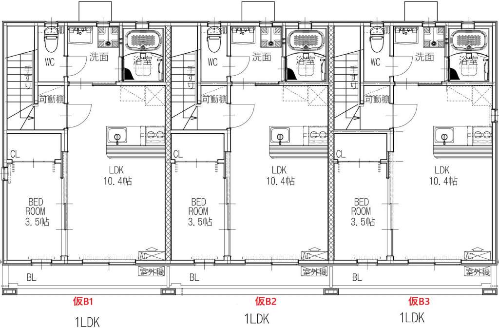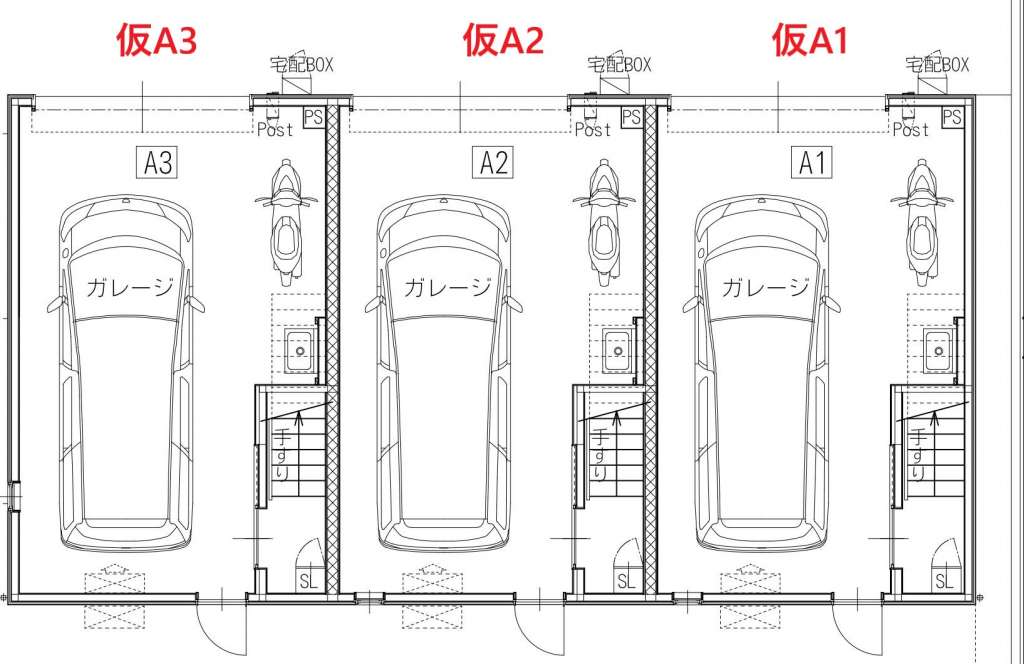 | A3 | 1K+BED | LDK10.5帖 | ガレージ幅4.1m×奥行6.5m(最大部分) | ー | リモコン式電動シャッター幅3.0m×高さ2.2m | 入居中 | ||