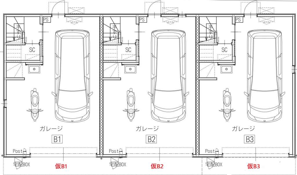 | B3 | 1LDK | LDK10.4帖+洋室3.5帖 | ガレージ幅4.8m×奥行7.1m(最大部分) | ー | リモコン式電動シャッター幅3.5m×高さ2.2m | 入居中 |
